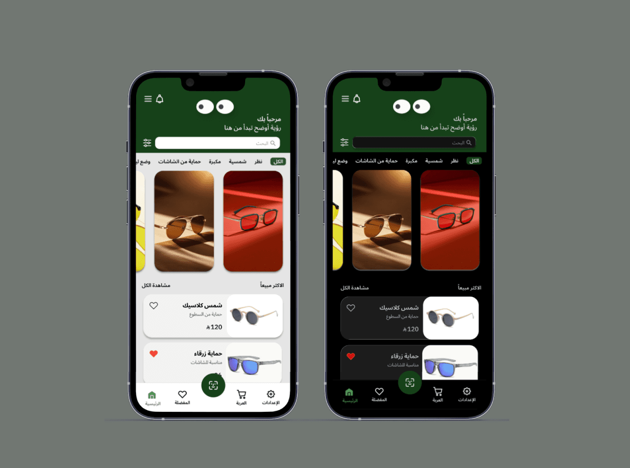 تصميم الواجهتين يحافظ على نفس البنية والتنظيم لضمان تجربة استخدام متسقة، مع تغيير الألوان والتباين فقط بما يتناسب مع كل وضع