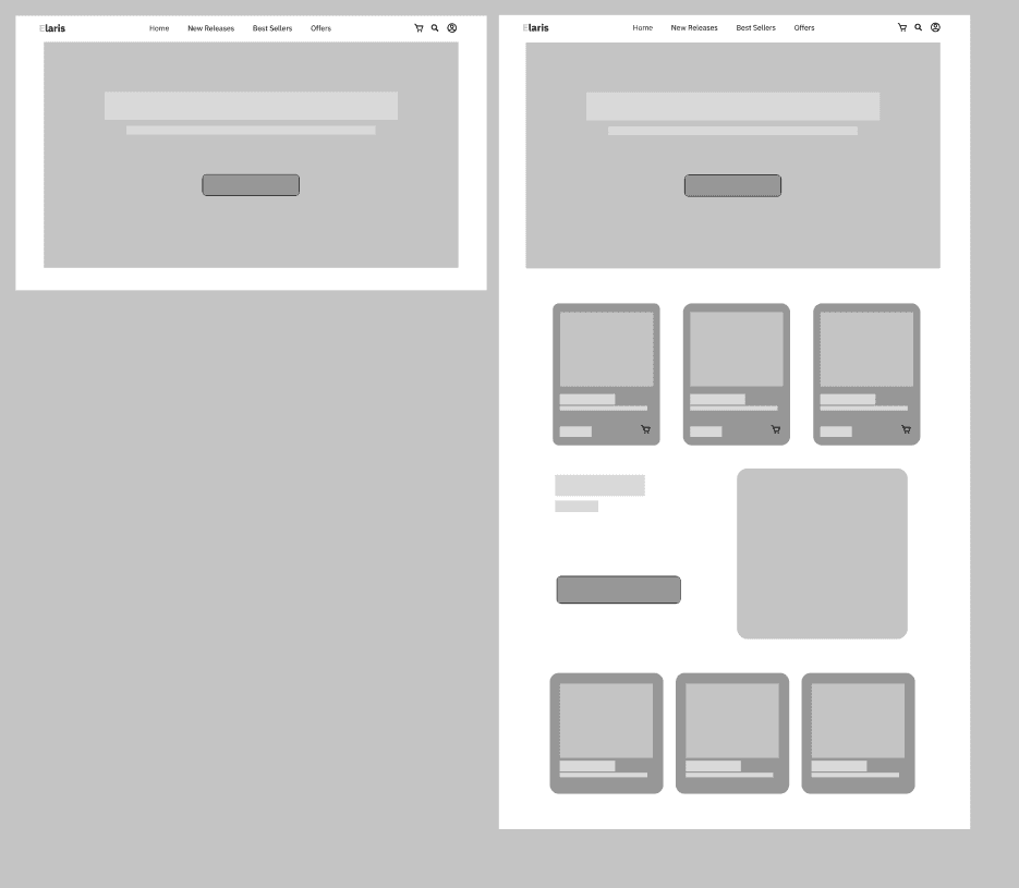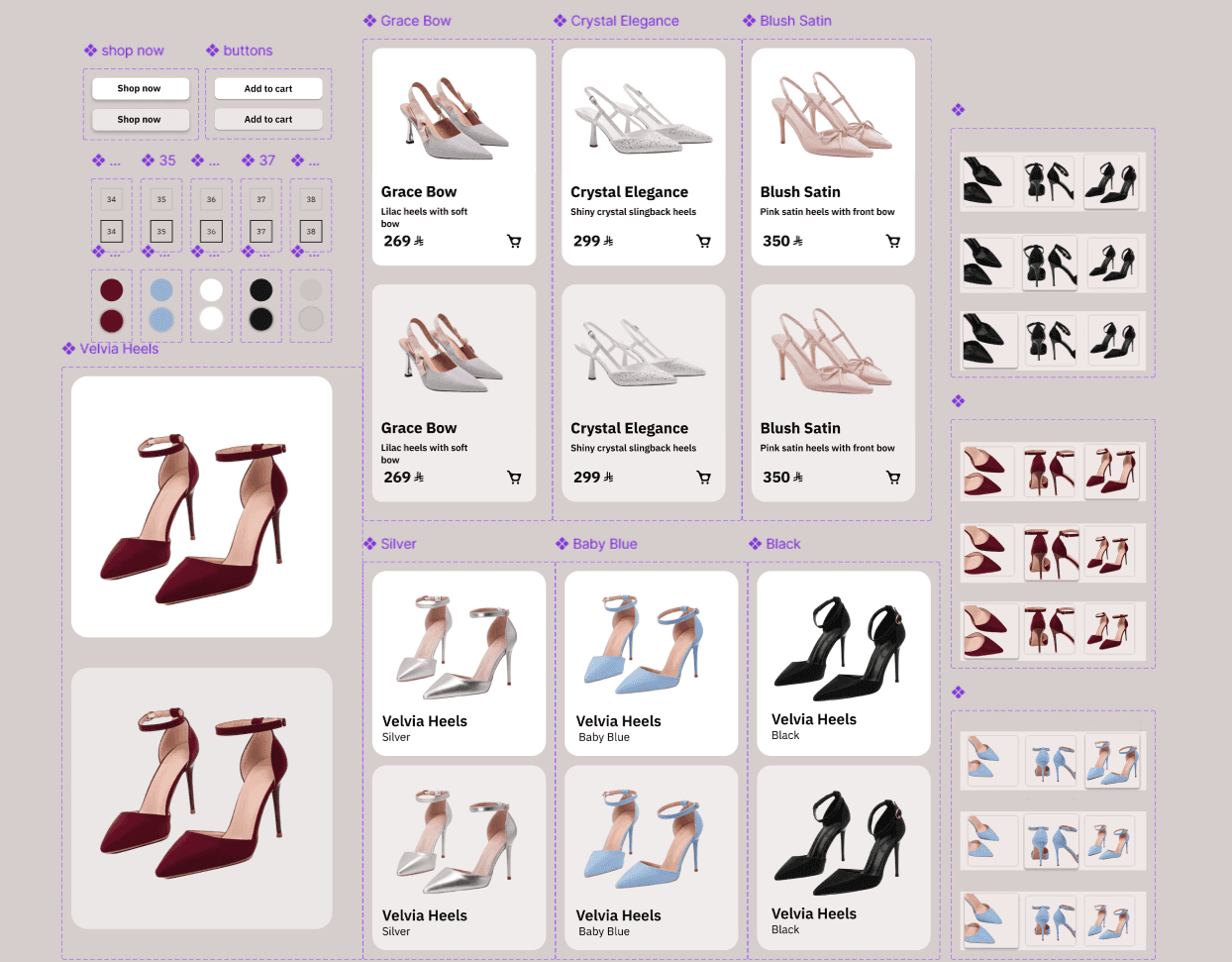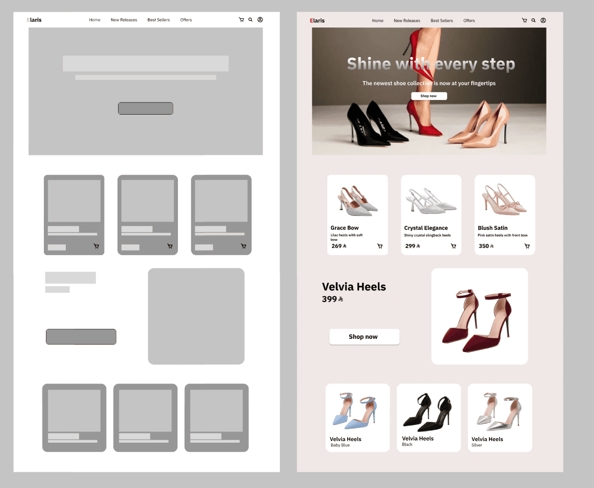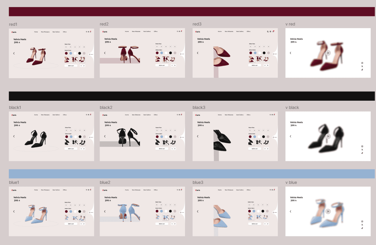 تم تصميم عدة واجهات لعرض تجربة التسوق داخل المتجر الإلكتروني، مع التركيز على تنظيم المنتجات بشكل واضح وتسهيل التنقل بين الصفحات. يوضح التصميم كيفية عرض المنتجات، واختيار المقاس واللون، بالإضافة إلى إبراز المعلومات المهمة للمستخدم بطريقة بسيطة وسهلة الفهم